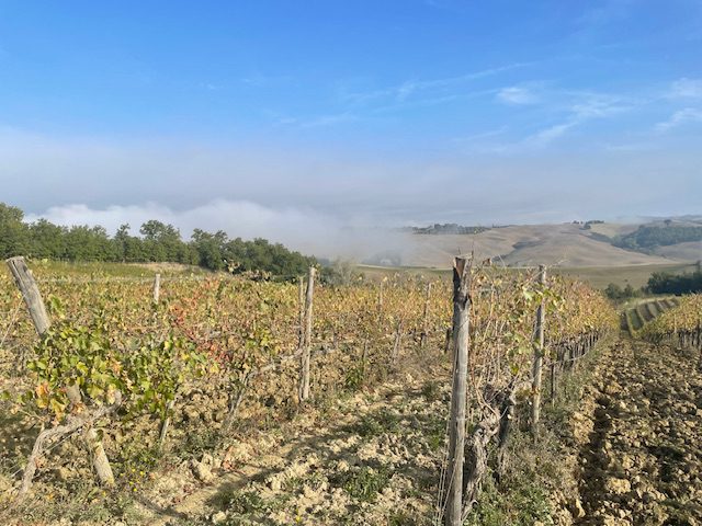Another sweet, cool, misty morning and we were up and on our way into the hills leading up to San Quirico D’Orcia. Misty clouds hugged the lower valleys, while the sun broke through higher up.